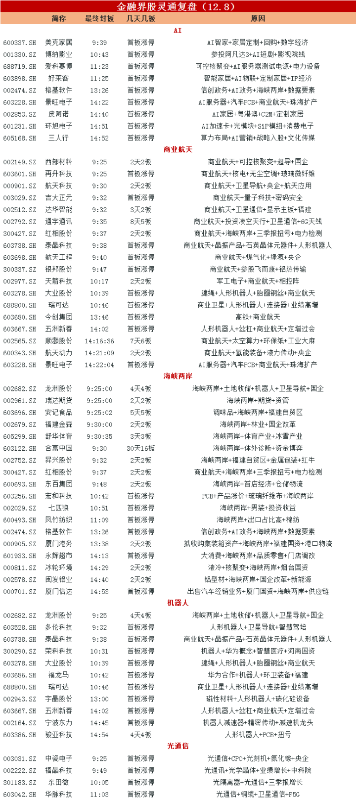 海峡两岸概念再度爆发,安记食品等多股涨停。商业航天概念延续强势,顺灏股份等涨停。