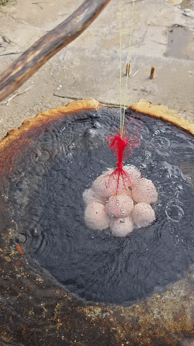 用网袋装好,放入天然沸泉中